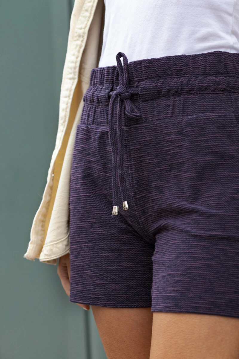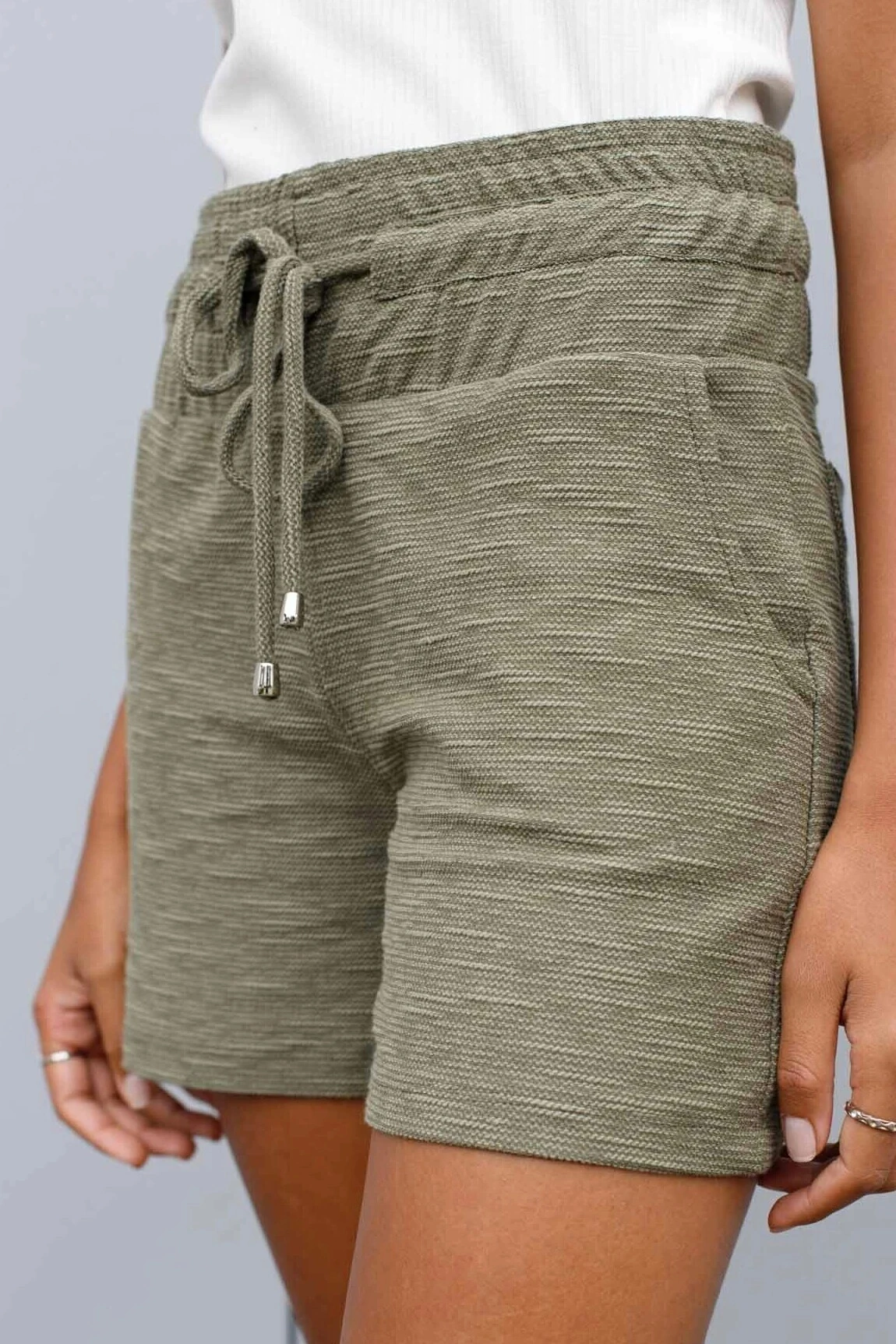Elástico na cintura + cós drapiado com cordãozinho para ajuste.