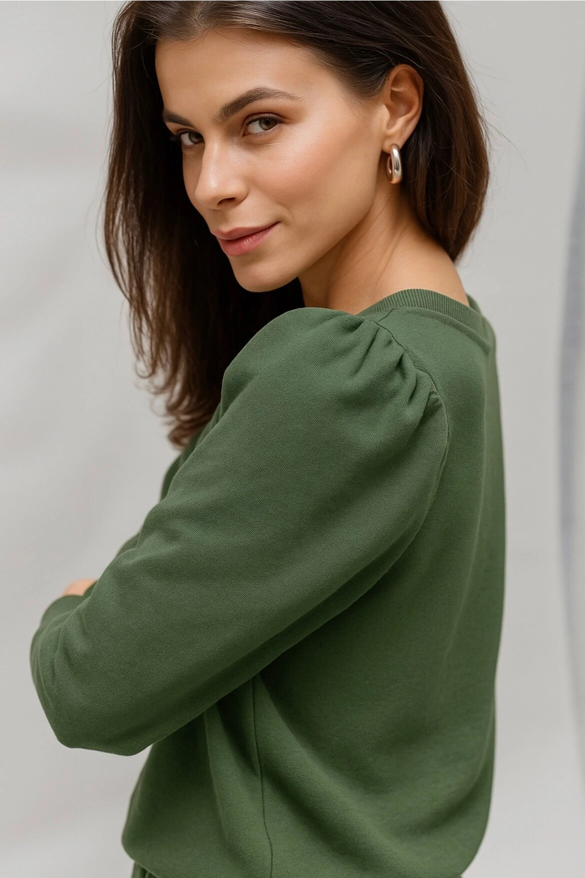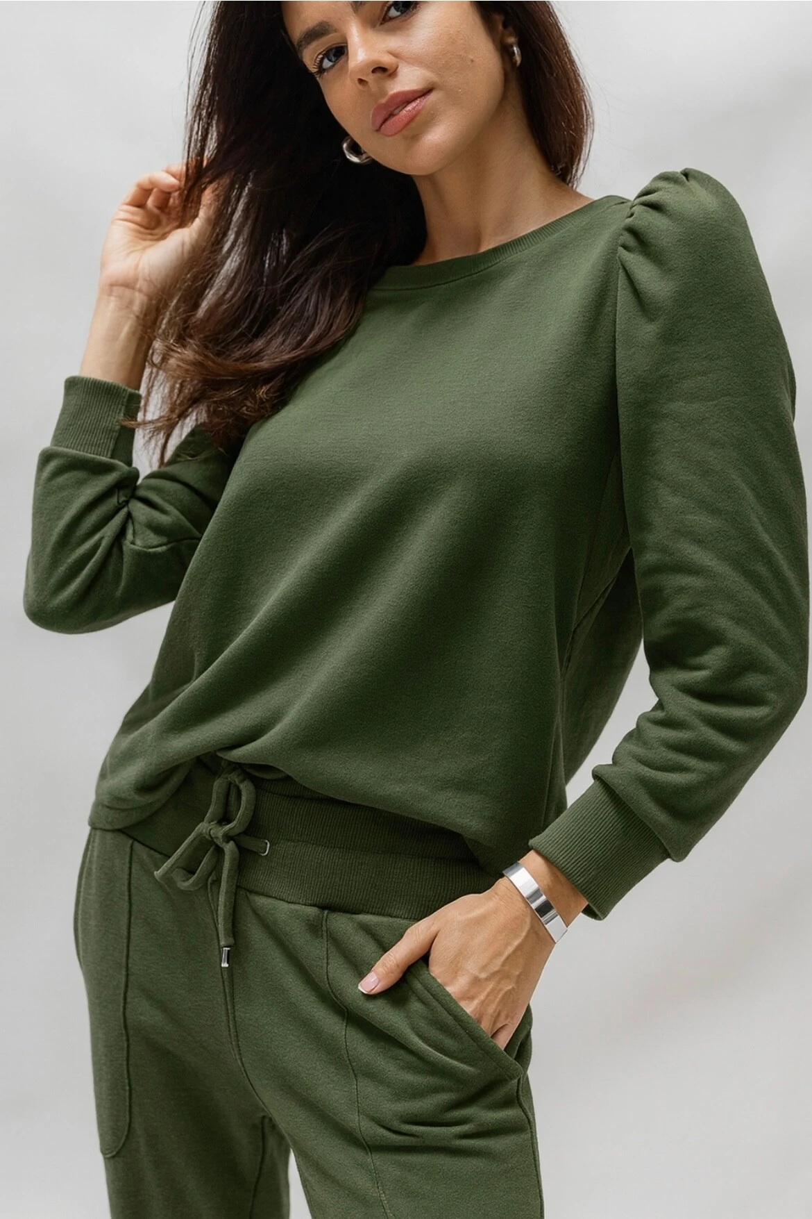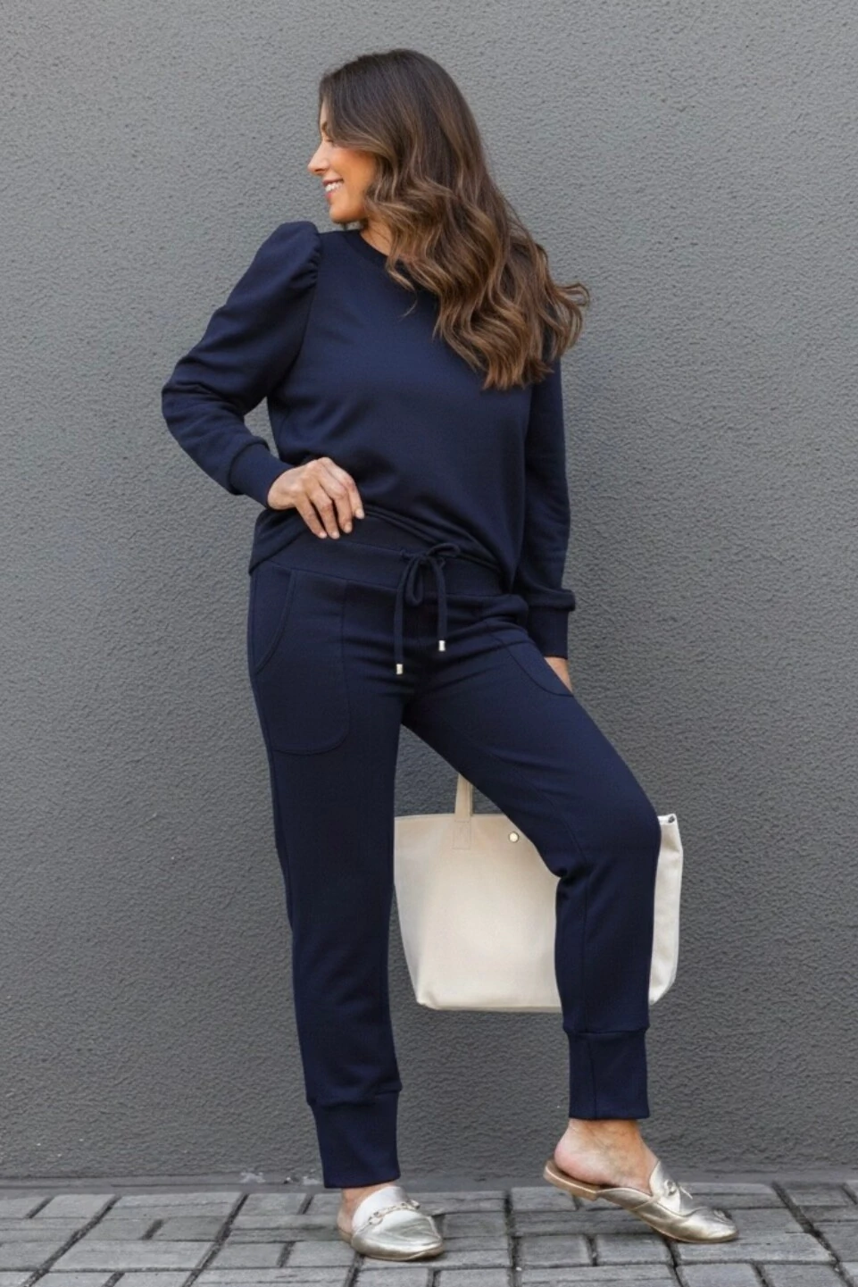Calça modelagem reta com elástico na cintura + cordão para ajuste. Blusa manga longa com detalhe bufante no ombro.