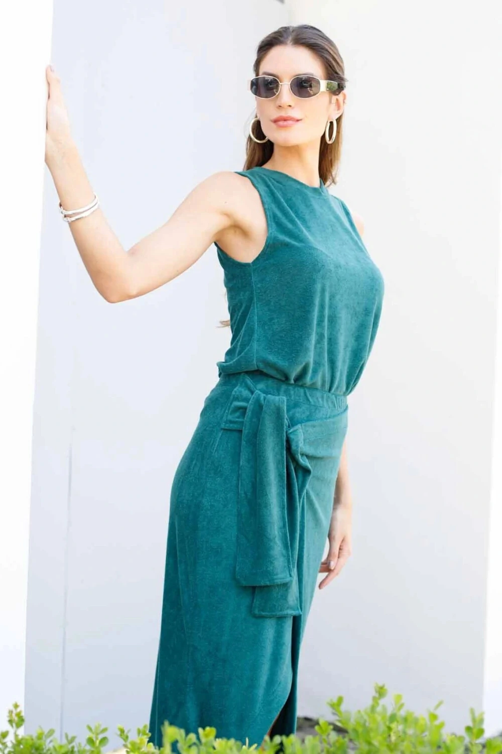 O charme vem na saia transpassada na cintura, deixando uma fenda na parte da frente com caimento leve. Regatinha modelagem solta.